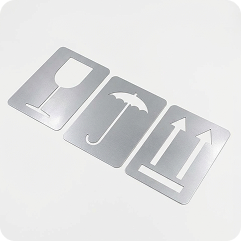 Набор состоит из трех трафаретов: знак «Хрупкое. Осторожно», знак «Беречь от влаги» и знак со стрелками «Верх»